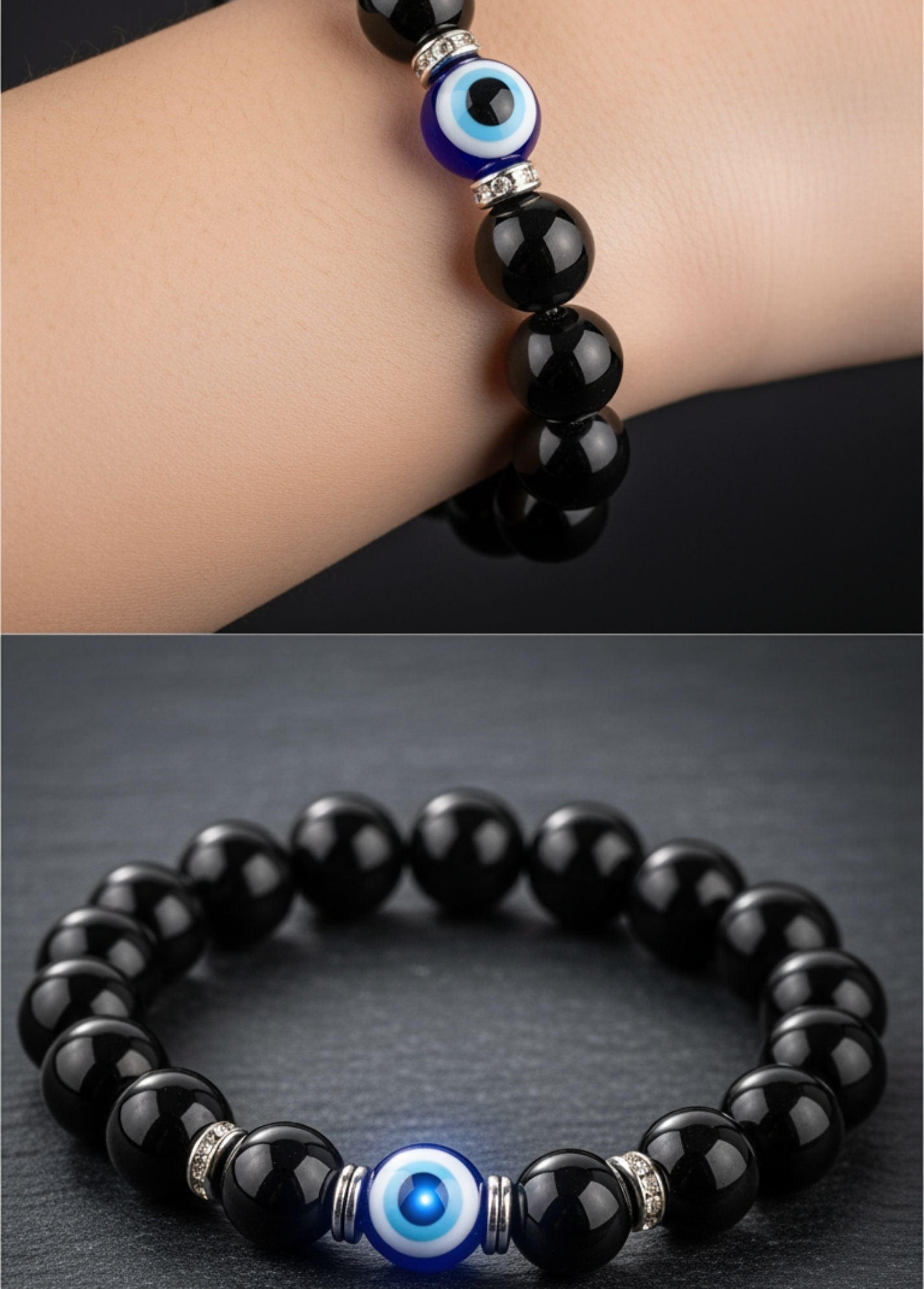 The bracelet features high-quality black beads, designed to ensure durability and comfort, while the beautifully crafted nazar amulet serves as the focal point of this exquisite piece. Its timeless design makes it an ideal accessory for daily wear, complementing all outfits, from casual to formal.